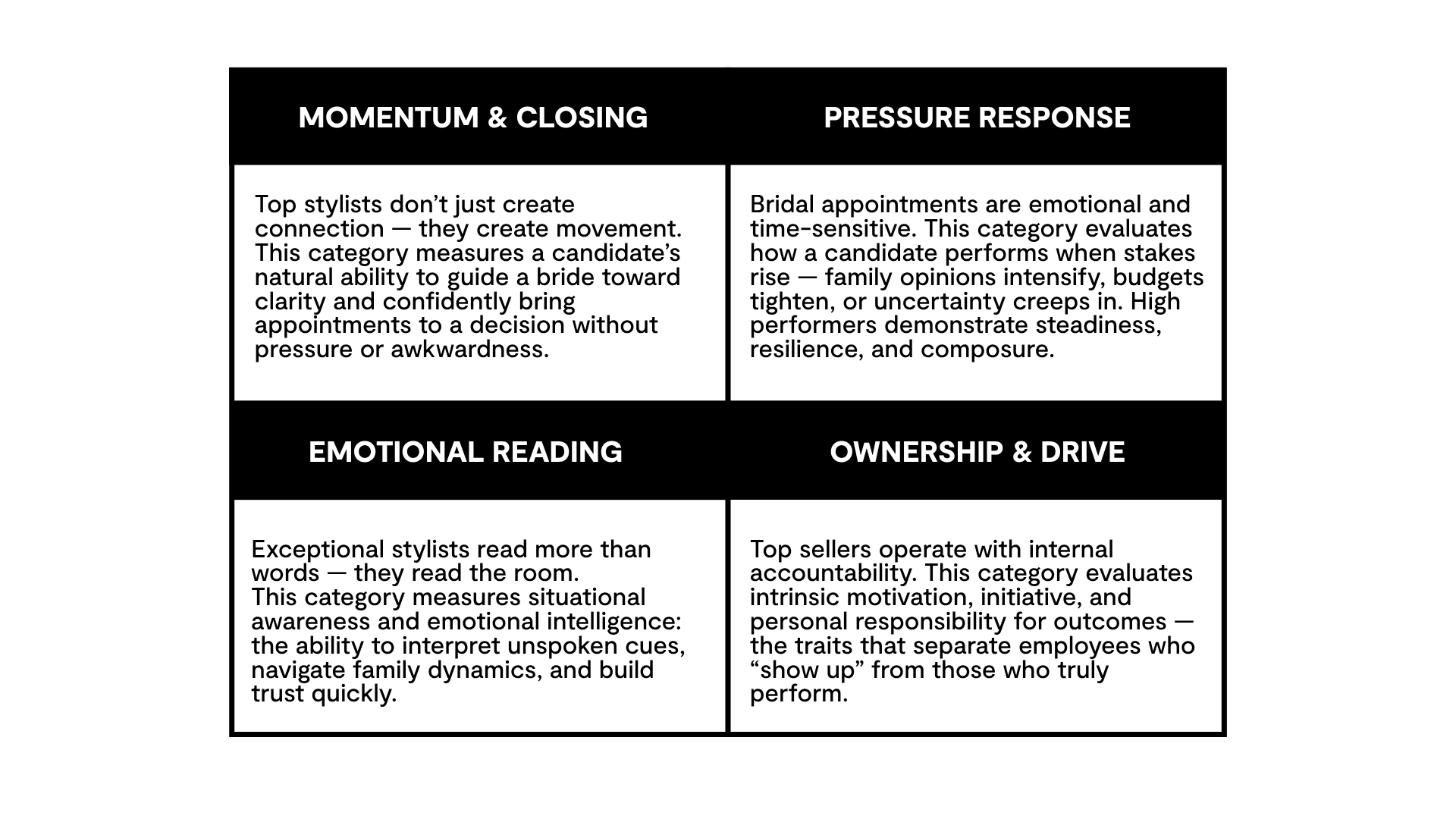 In partnership with a third-party research firm, we analyzed behavioral assessment data from more than 200 top-performing bridal stylists across five countries. We identified repeatable performance traits shared by the highest sellers—regardless of geography, market size, or store volume. Then we built a proprietary assessment around those patterns. The Bridal Success Index is not a personality quiz. It is a performance predictor.